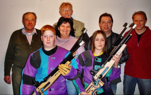 Foto von links nach rechts: Ehrenschützenmeister Hans Diestler, Schriftführerin Christiane Herbach, 2. Schützenmeister Horst Schmidt, Sportwart Uwe Koch, Jugendleiter Peter Frisch Vorne: Felix Zwack und Melanie Tittel Foto Günter Herbach |